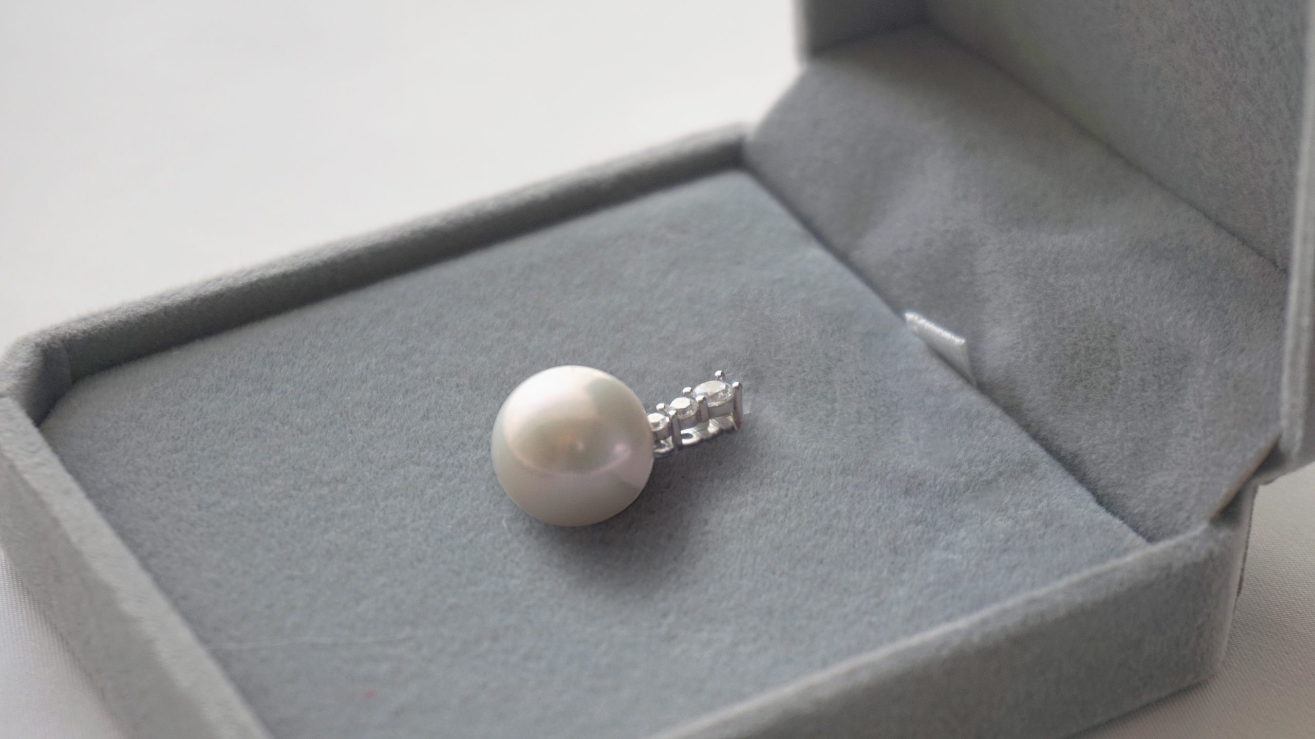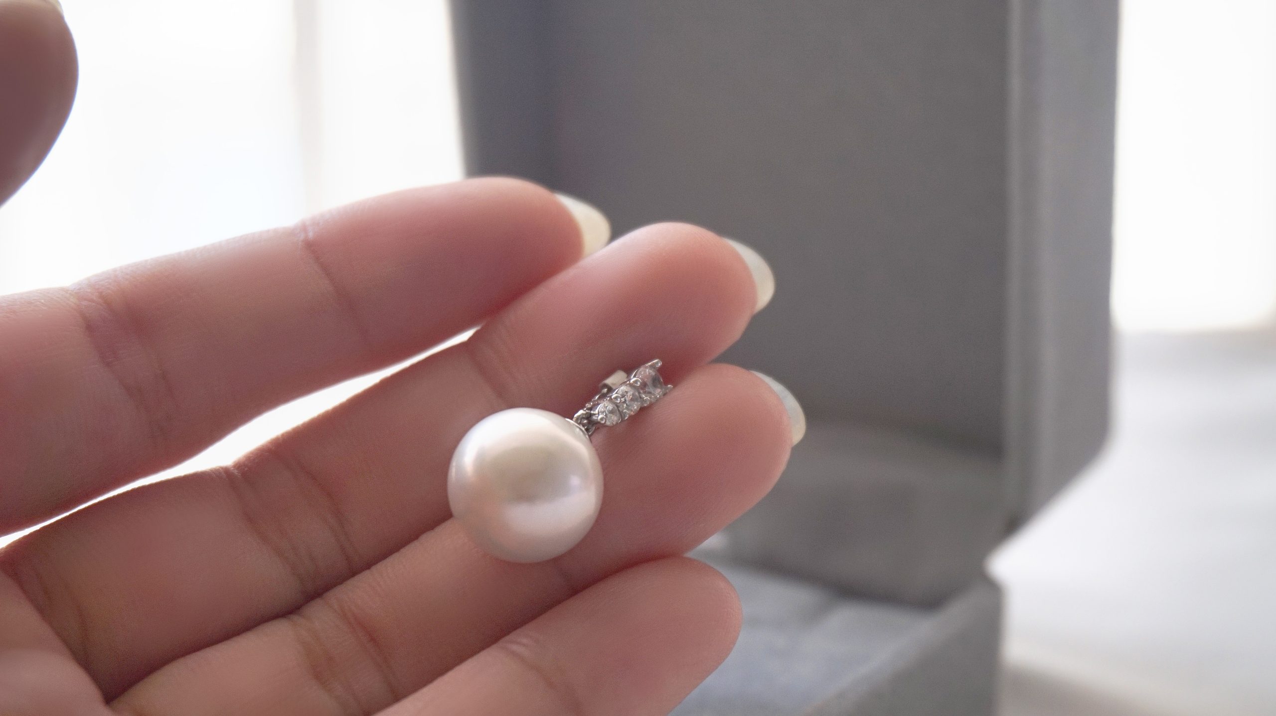 甄选 12mm 近圆淡水珍珠,自带粉紫晕彩,表面仅保留自然生长的细微纹理;银质扣头采用三颗梯方钻错落排布,切割面精准对齐光线,让钻的闪耀成为珍珠的低调注脚。