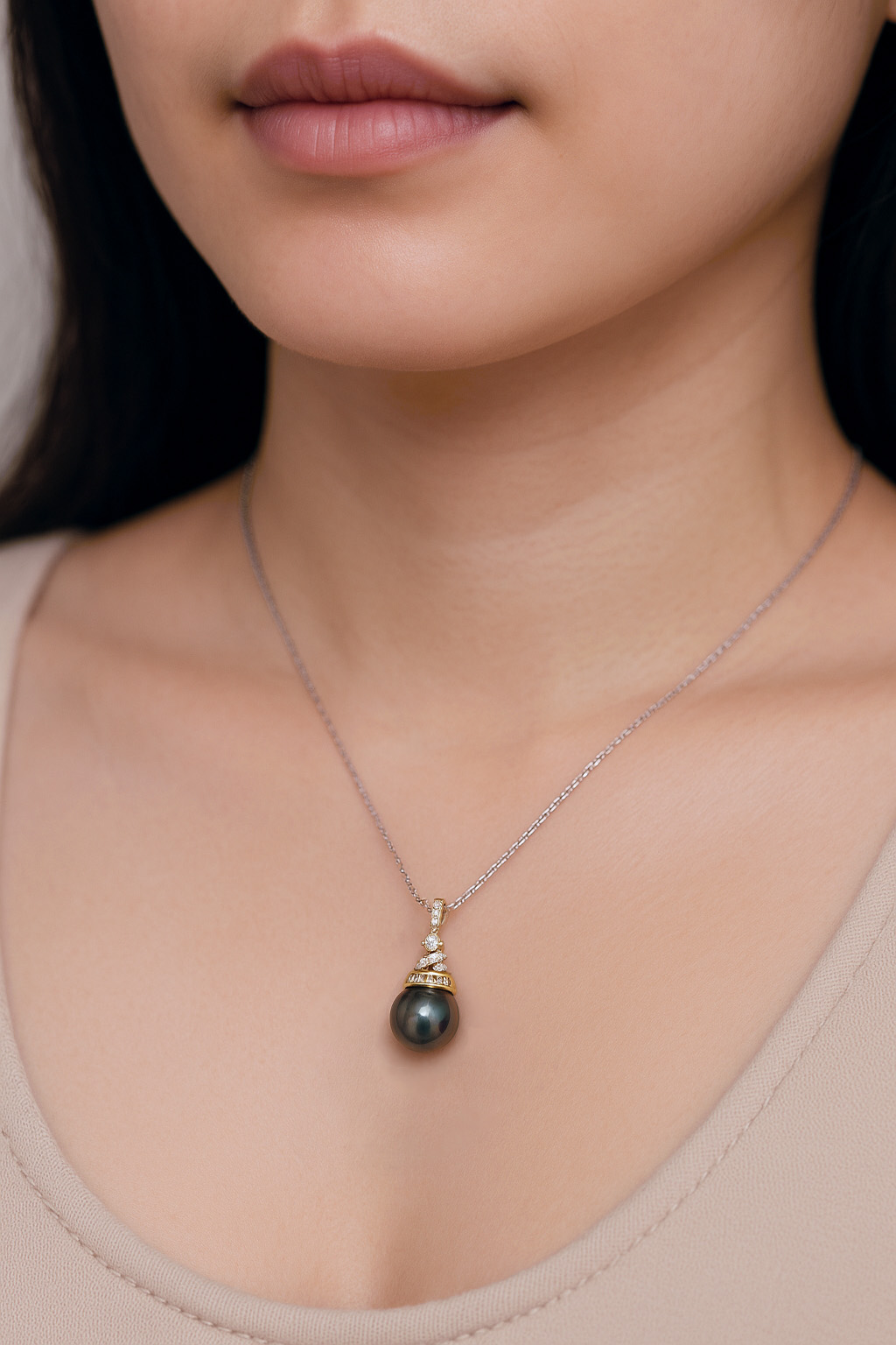 大溪地黑珍珠历经 5 年孕育,水滴形轮廓是洋流打磨的痕迹,表面的虹彩是深海光影的沉淀;18K 金扣头如火山熔岩凝结的冠冕,镶嵌的细钻是岩浆迸溅的星芒。